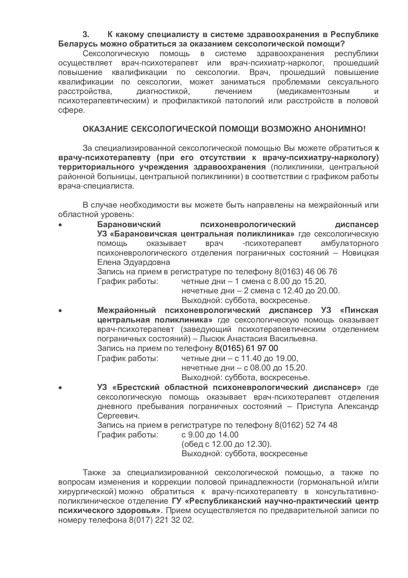 Помощь лицам с расстройством половой идентификации, половыми дисфункциями, расстройством полового предпочтения оказывается в УЗ «Ляховичская ЦРБ» врачом психиатром Тупальской Альбиной Николаевной. по записи через регистратуру по телефону 6-39-04 или психологом по телефону 6-53-60 и при личном обращении. График работы: ежедневно пн-пт 8.00 -15.00. Помощь может оказываться анонимно.